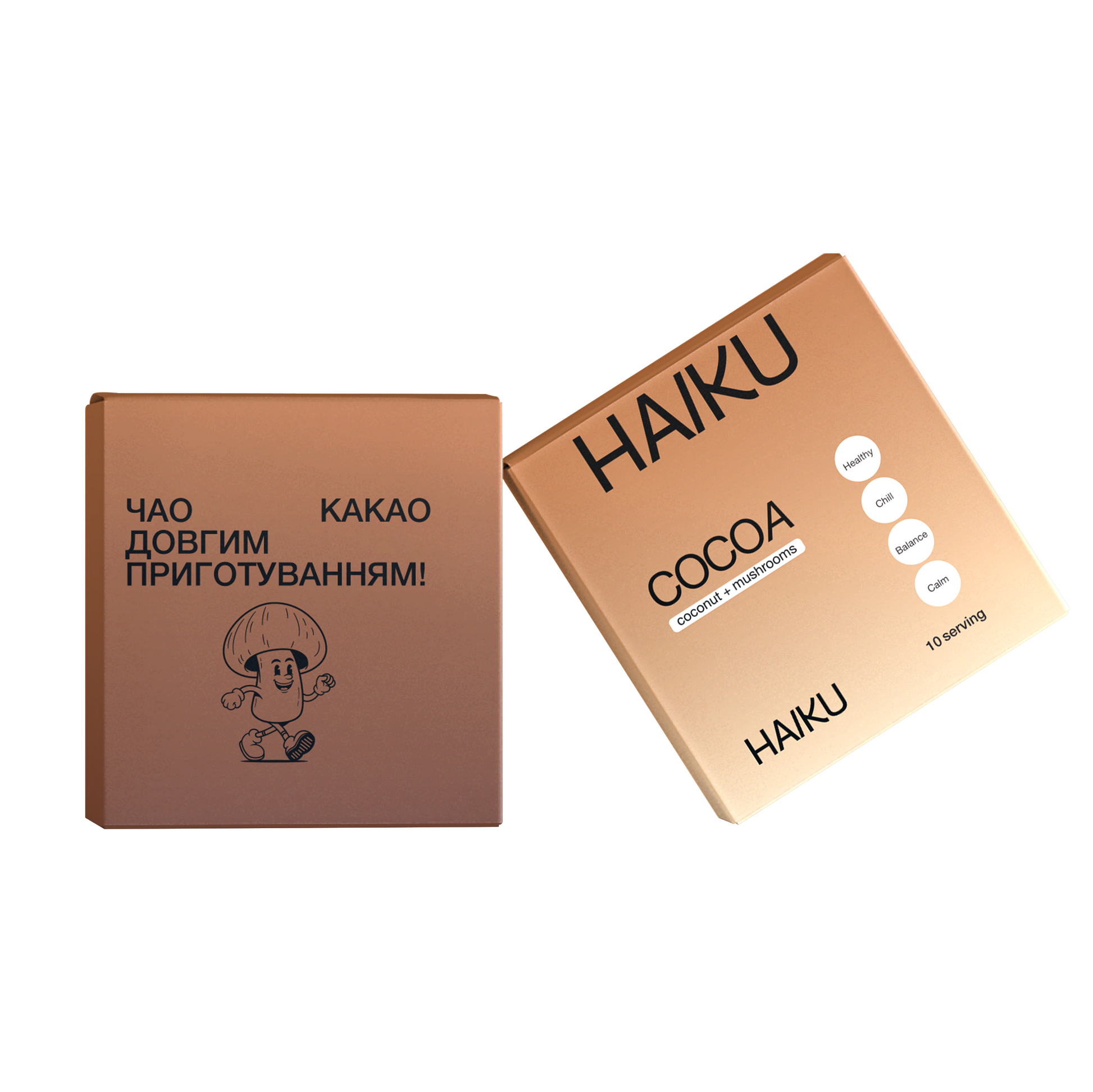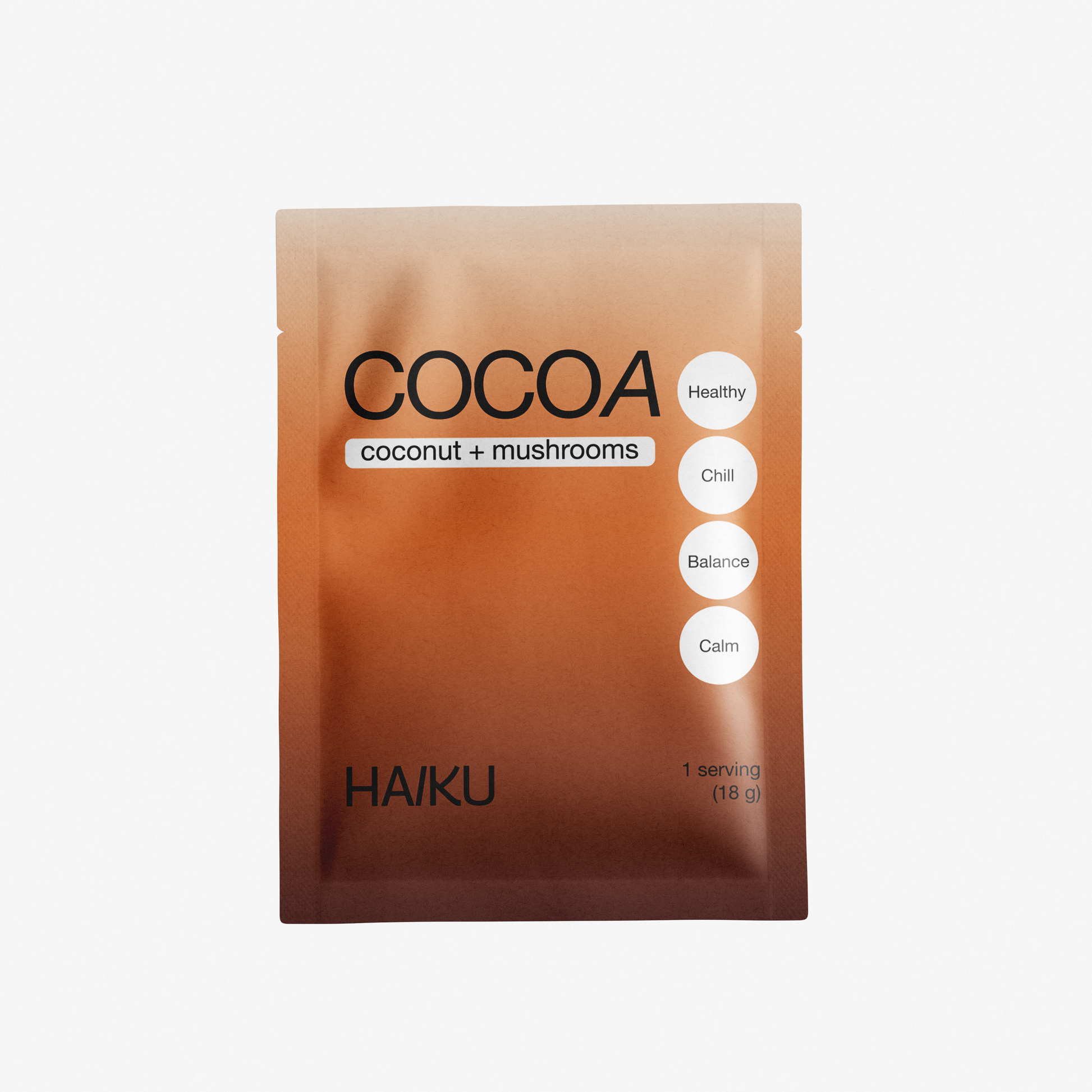Міцний смак какао брют, ніжного кокосового молока та суміші екстракту грибів: рейші - для спокою, чага - для захисту імунітету, їжовик гребінчастих - для фокусу.
