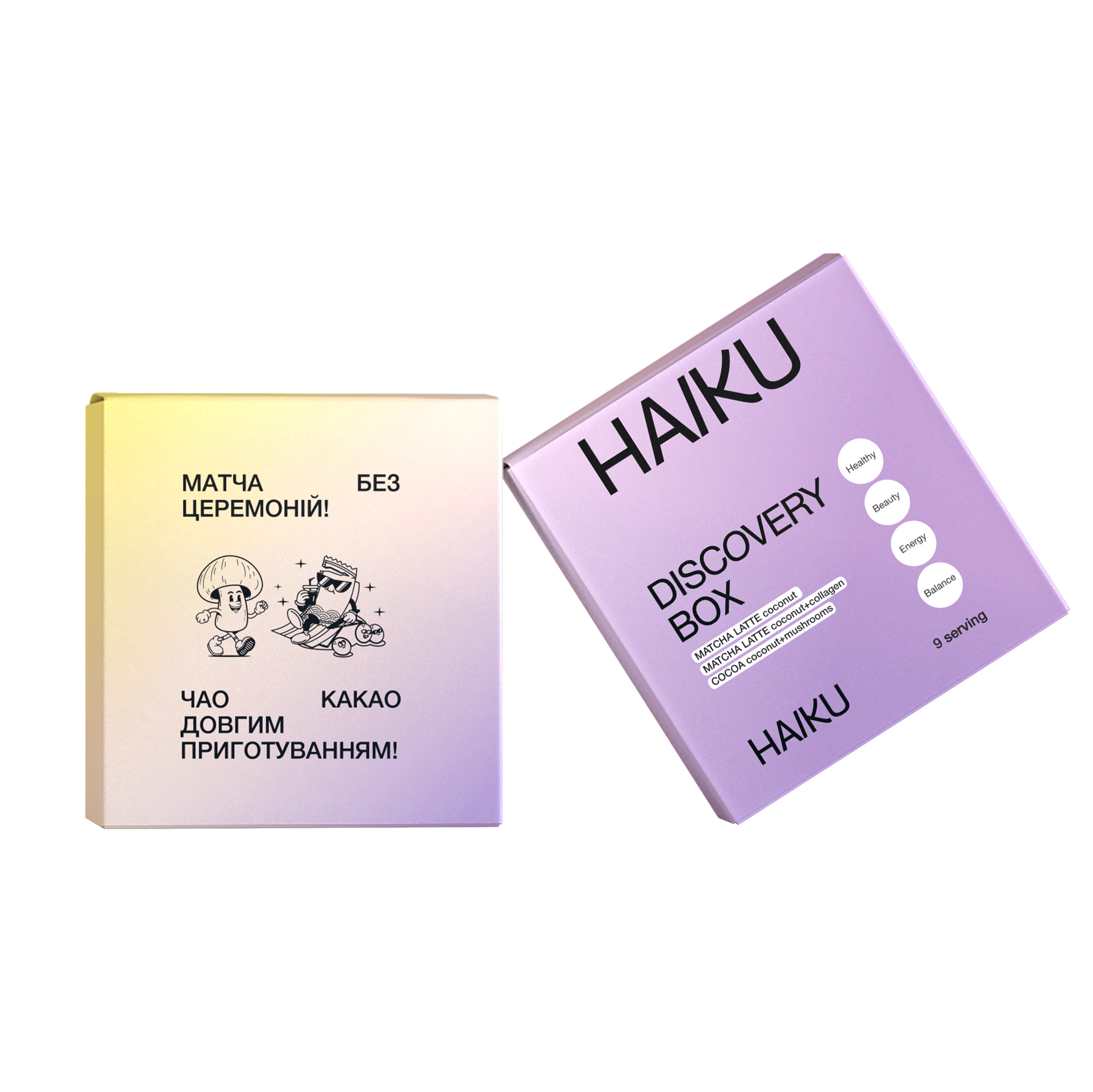В коробці 9 саше - по 3 напої кожного виду: кокосова матча, кокосова матча з колагеном, кокосовий какао з екстрактом грибів